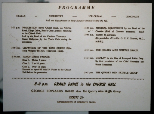 Program fra en byfest holdt ved kirken, hvor John og Paul spiller offentligt sammen for første gang.